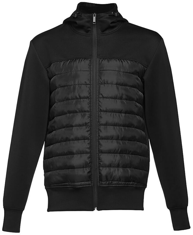 Pánská bunda, s kapucí. Polyester 300T (95% polyester a 5% spandex): 150 g/m². Kapuce s brzdičkami. Vnitřní kapsy. Horní část v oblasti hrudníku vhodná pro potisk.