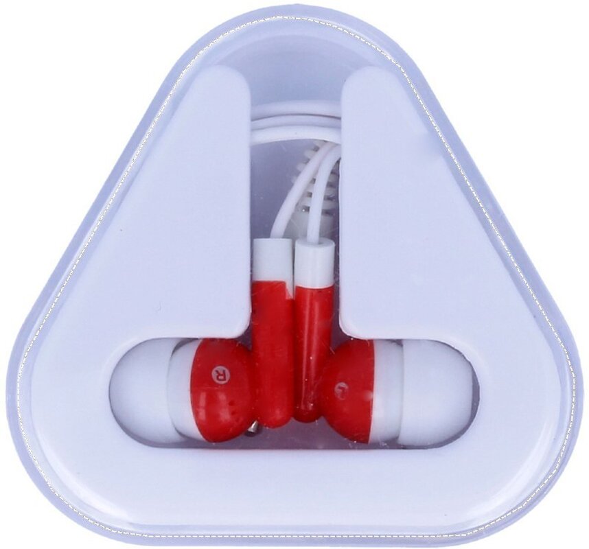 Sluchátka z PVC v trojúhelníkovém balení. Délka kabelu 120 cm.
