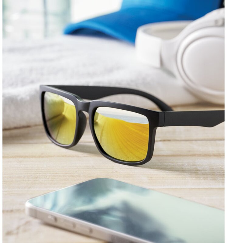 Festivalové sluneční brýle se zrcadlovými skly a matným pogumovaným rámečkem. Lehký a pohodlný model, který doplní letní outfit a zároveň ochrání oči před sluncem.