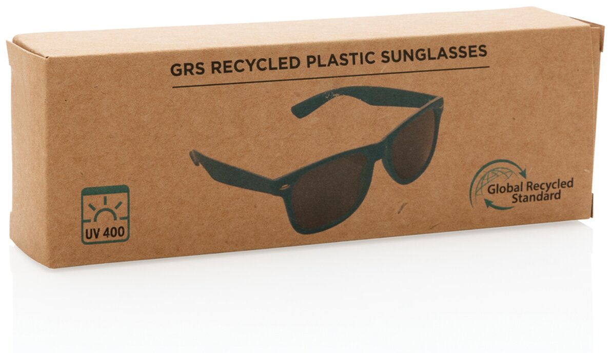 Vysoce kvalitní sluneční brýle z GRS certifikovaného recyklovaného plastu. Certifikace zaručuje skutečné obsažení recyklátu. Konstrukce brýlí je ze 100 % recyklovaného PC plastu, zatmavená sklíčka z akrylu odpovídající UV 400 a CAT 3. Podíl použitého recyklovaného materiálu vzhledem k celkové váze produktu: 65 %. Baleno v kraftové dárkové krabičce.