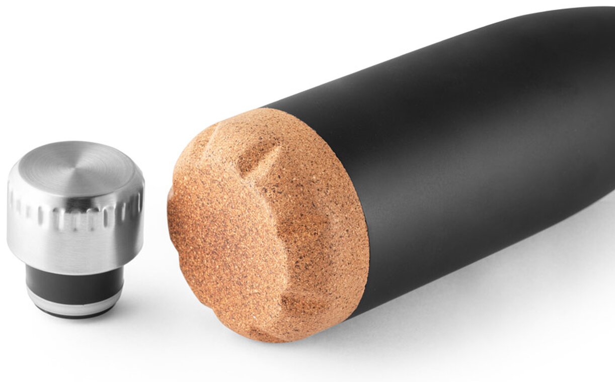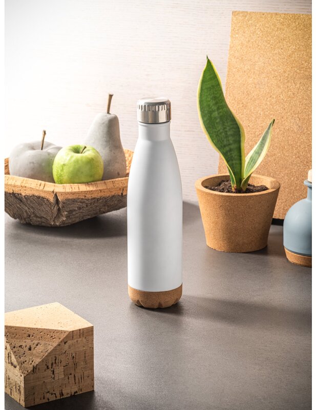 Dvoustěnná vakuově izolovaná láhev z nerezové oceli s korkovým dnem. Udrží nápoje teplé po dobu 8 hodin a studené po dobu 24 hodin. Kapacita až 560 ml. Dodáváno v dárkové krabičce z kraftového papíru. ø71 x 258 mm