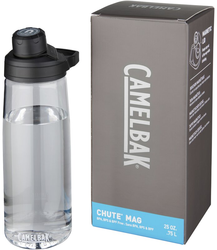 Outdoorová láhev Chute Mag 750 ml ze silného materiálu Tritan™, díky kterému je velmi odolná vůči roztříštění, skvrnám a zápachu. Šroubovací uzávěr má magnetický úchop, který je při pití skrytý. Ergonomický ventil pro pití s vysokým průtokem zabraňuje rozlití nebo stříkání nápoje. Díky širokému otvoru se láhev pohodlně plní a čistí. Dodává se v exkluzivní dárkové krabičce CamelBak.