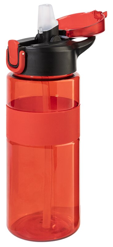 Sportovní láhev z RPET se silikonovým úchopem, automaticky otevíratelným odklápěcím víčkem s integrovaným brčkem, silikonovým náustkem a bezpečnostním zámkem.