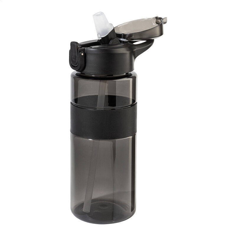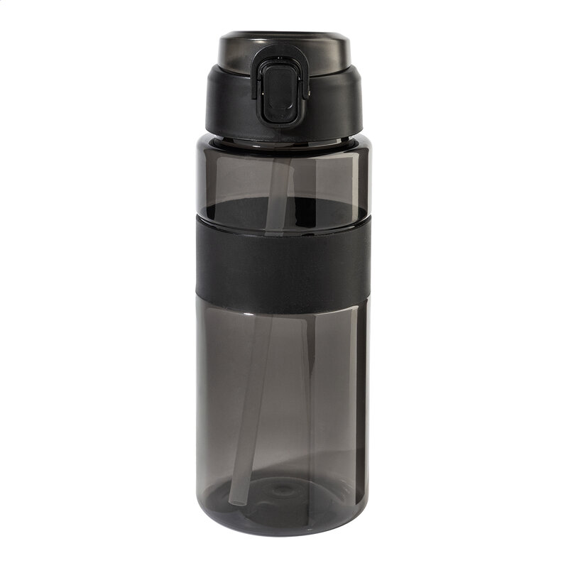 Sportovní láhev z RPET se silikonovým úchopem, automaticky otevíratelným odklápěcím víčkem s integrovaným brčkem, silikonovým náustkem a bezpečnostním zámkem.