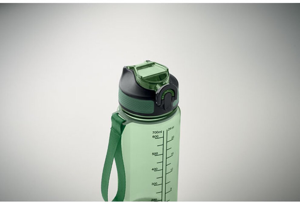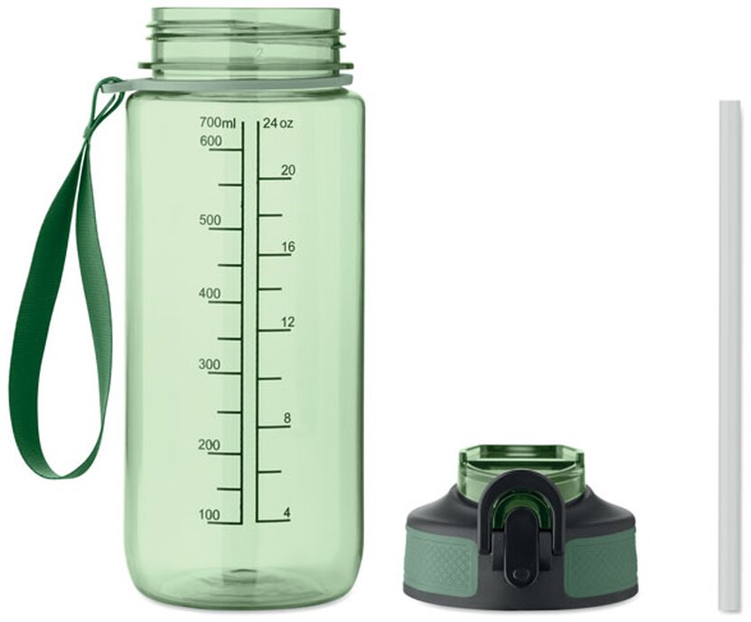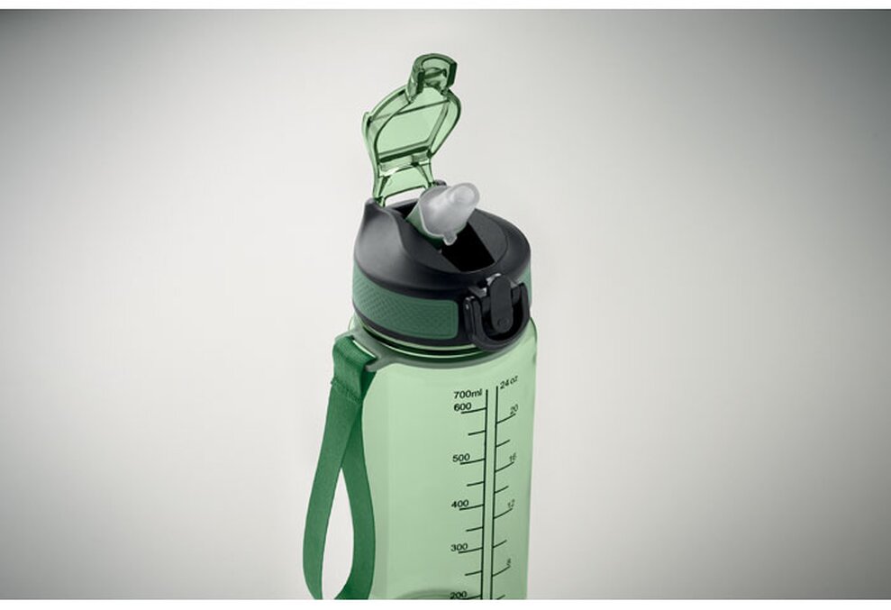 Sportovní láhev z RPET, navržená pro pohodlné pití během pohybu i běžného dne. Díky integrovanému brčku, měkkému silikonovému náustku a víčku s otevíráním jednou rukou umožňuje rychlou hydrataci bez zbytečného zdržování. Bezpečnostní zámek zabraňuje nechtěnému otevření a láhev je nepropustná. RPET poutko usnadňuje přenášení.