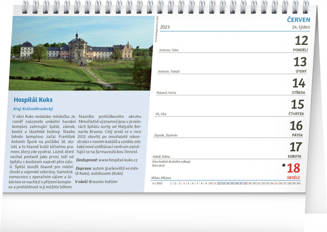 Dochází vám nápady a fantazie, kam vyrazit na výlet? V našem stolním kalendáři naleznete 53 tipů na nová dobrodružství. Ideální a praktický kalendář, který se stane pomocníkem pro všechny aktivní výletníky. Vyberte cíl své příští cesty se stolním kalendářem, který kromě českého kalendária obsahuje také svátky a památné dny, fáze měsíce a přehled na celý rok.