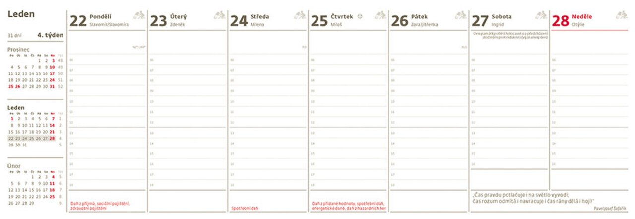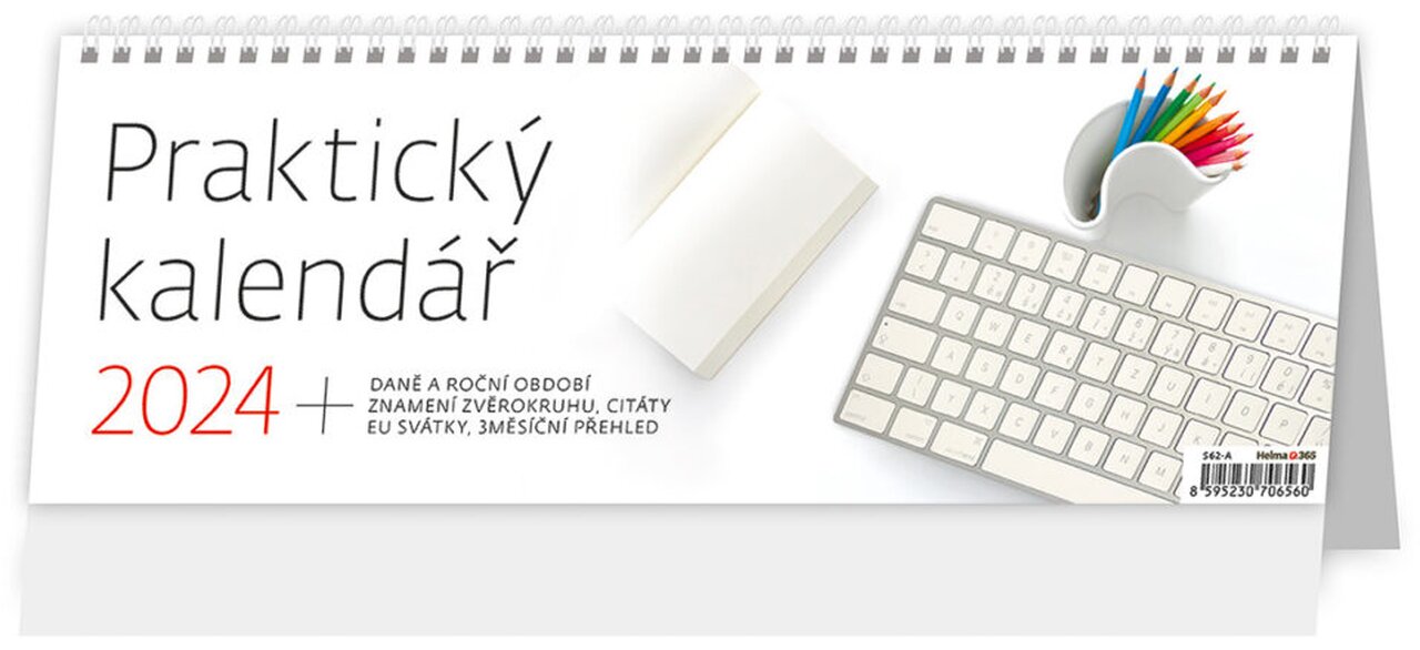 Stolní kalendář s přehledným kalendáriem doplněným o daně, roční období, znamení zvěrokruhu, citáty, EU svátky a tříměsíční přehled.