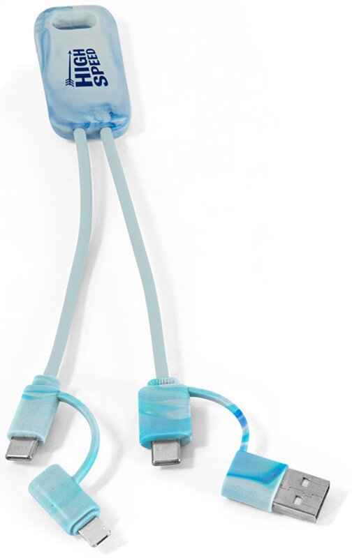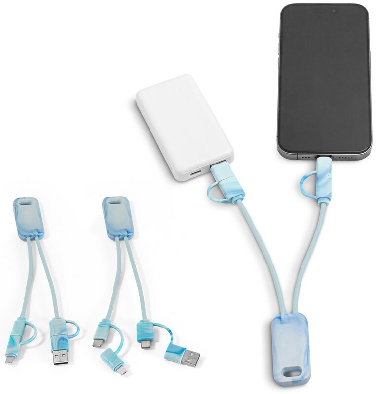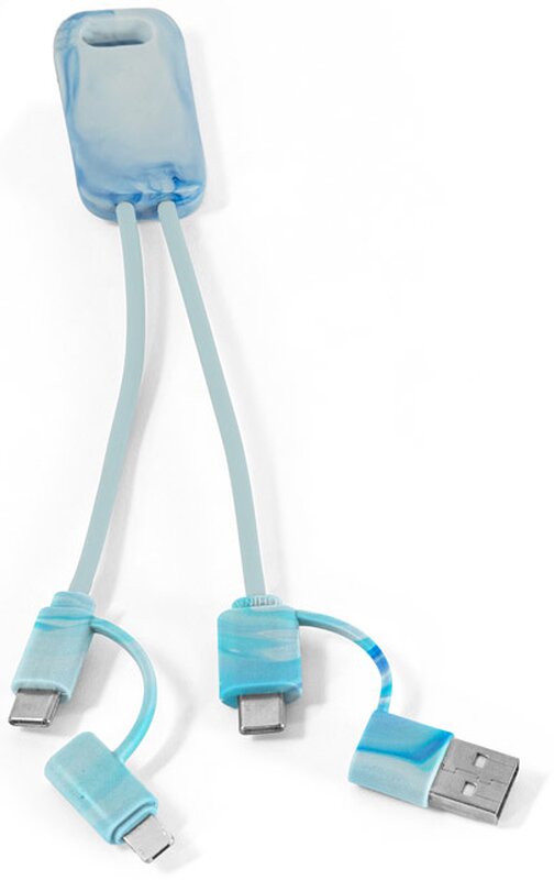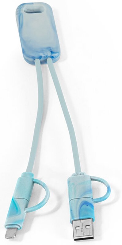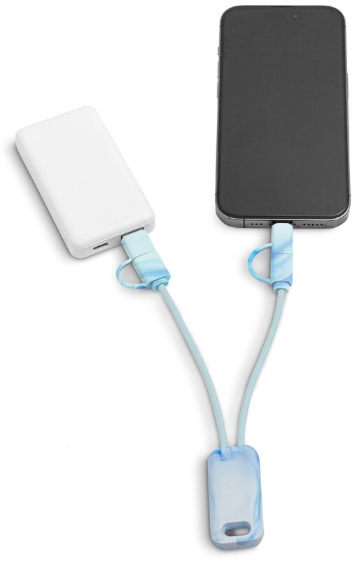 USB kabel BERNERS 6v1 je praktický a ekologický doplněk pro každodenní nabíjení a přenos dat. Vyrobený ze 100% recyklovaného PET v odstínech modré, které vznikají z recyklovaných uzávěrů lahví, díky čemuž má každý kus unikátní vzhled. Kabel je vybaven víceportovým zakončením – na jedné straně USB-C s adaptérem na USB-A, na druhé straně kombinace 2v1 microUSB a Lightning.