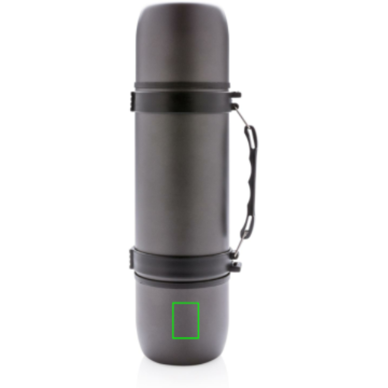 Elegantní vakuová termoska s kvalitní nepropustnou dvouplášťovou stěnou a dvěma šálky je ideální pro Vaše výlety a cestování. Termoska má úchyt s popruhem na rameno pro pohodlné použití. Termosku doporučujeme mýt v ruce, její objem je 700 ml.