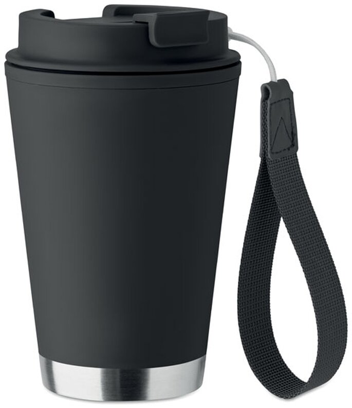 Dvoustěnný pohárek s vnitřní stěnou z PP, vnější stěnou z recyklované nerezové oceli a páskem na zápěstí z RPET. Objem: 300 ml.