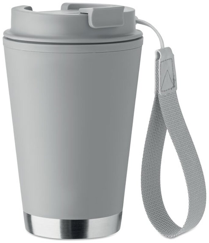 Dvoustěnný pohárek s vnitřní stěnou z PP, vnější stěnou z recyklované nerezové oceli a páskem na zápěstí z RPET. Objem: 300 ml.