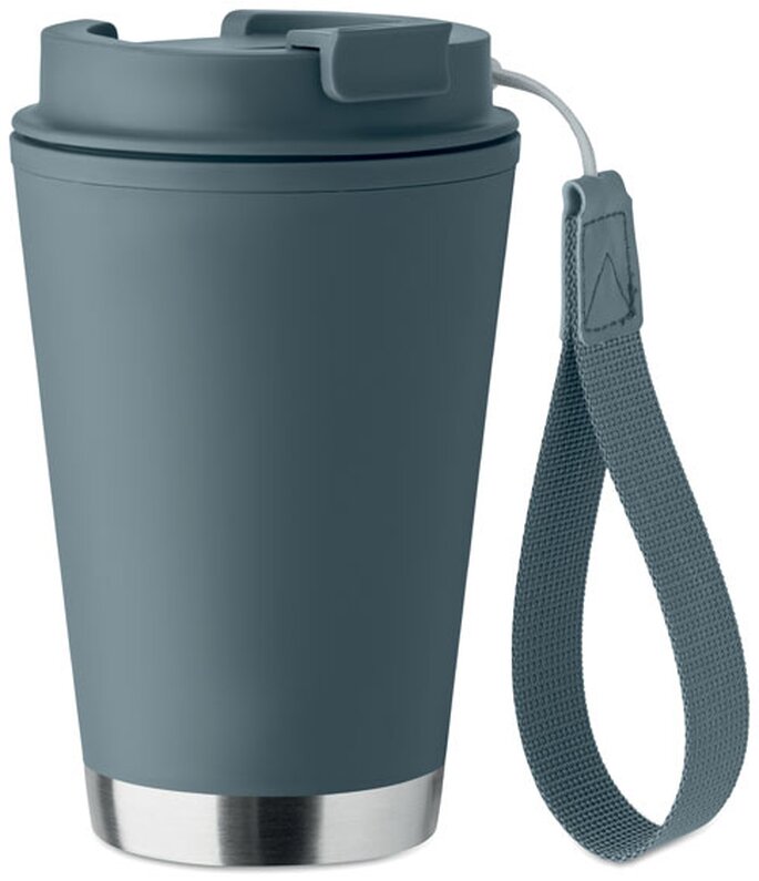 Dvoustěnný pohárek s vnitřní stěnou z PP, vnější stěnou z recyklované nerezové oceli a páskem na zápěstí z RPET. Objem: 300 ml.