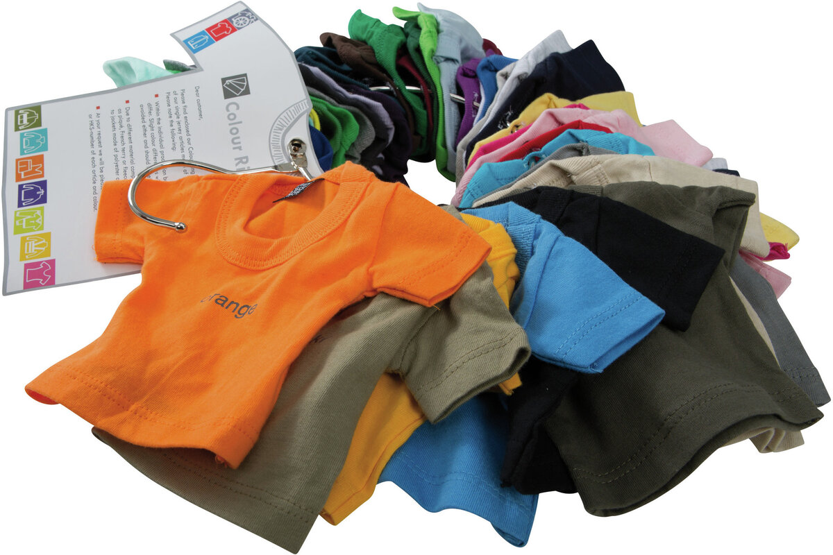 Vzorník barev v podobě mini triček, Na každém tričku je natištěn název barvy.