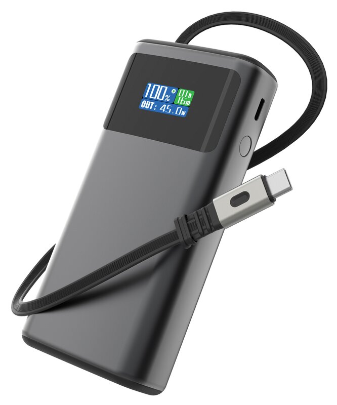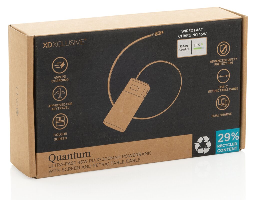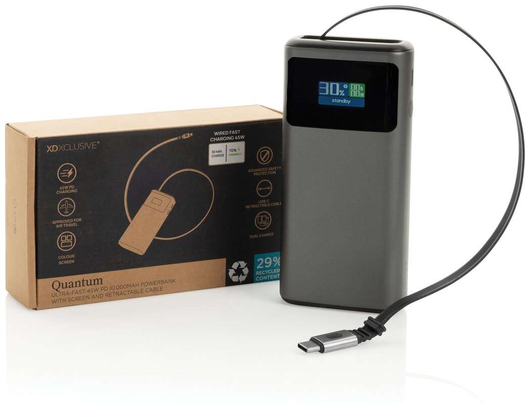 Powerbanka Quantum RCS s kapacitou 10 000 mAh nabízí ultrarychlé nabíjení až 45 W přes USB-C port. Vysoce kvalitní baterie třídy A zajišťuje stabilní výkon pro telefony, tablety i středně rychlé notebooky. Integrovaný zasouvací USB-C kabel (65 cm) je vždy připraven k použití. Barevný TFT displej zobrazuje aktuální hodnoty nabíjení a stav baterie.