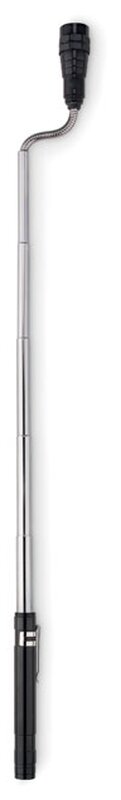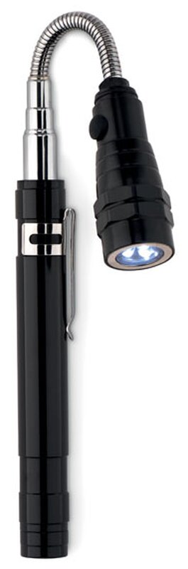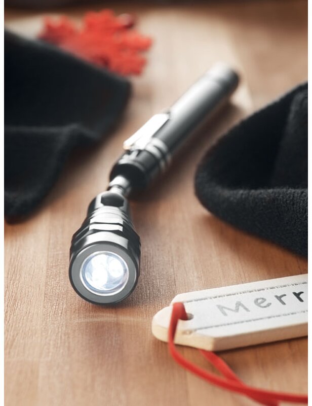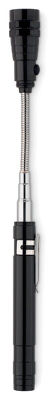 Výsuvná hliníková baterka s 3 LED světly, magnetem a klipem. Přiloženy 4 baterie LR44. Maximální délka 57 cm.