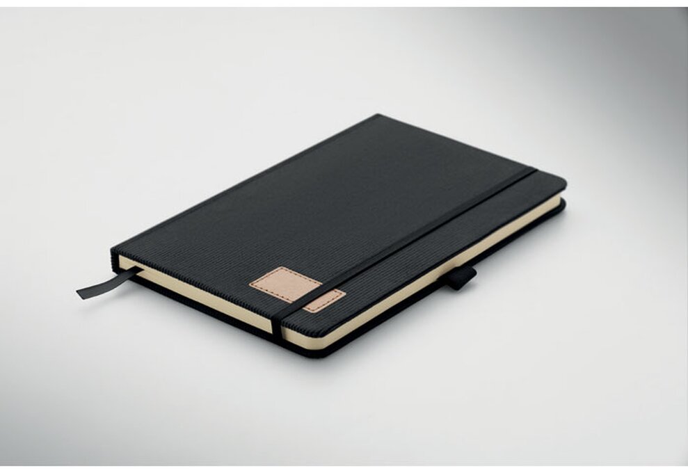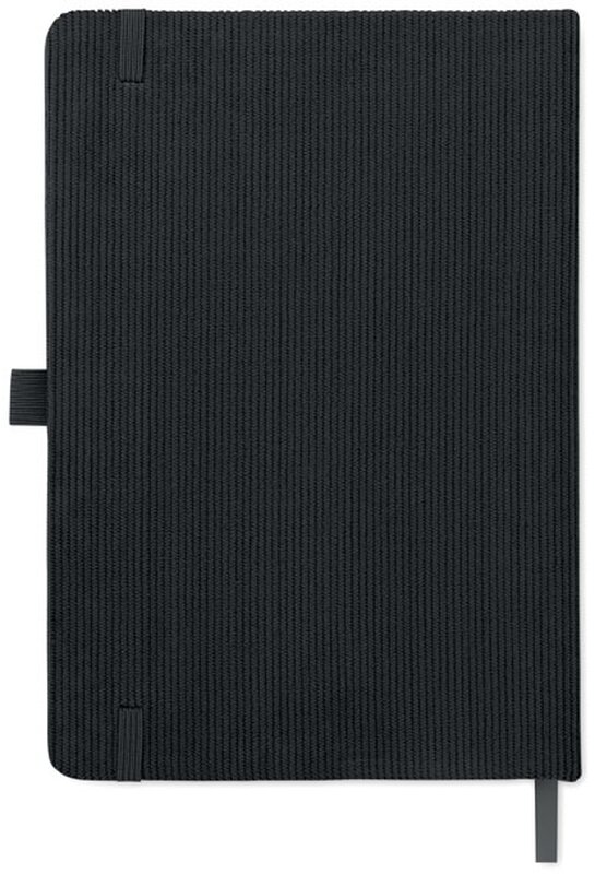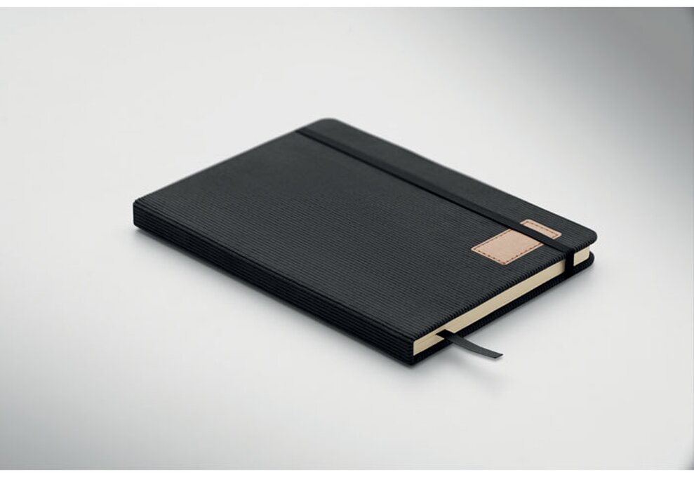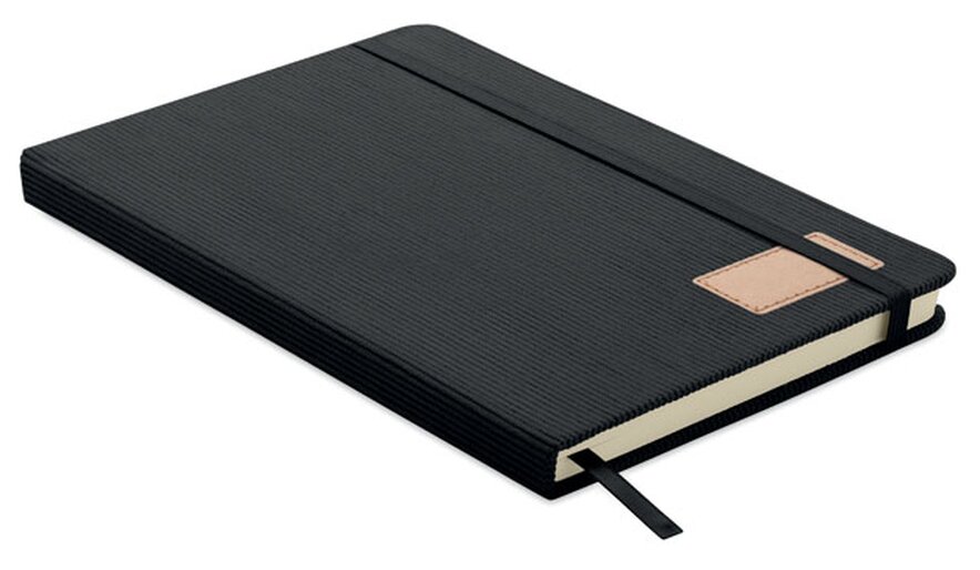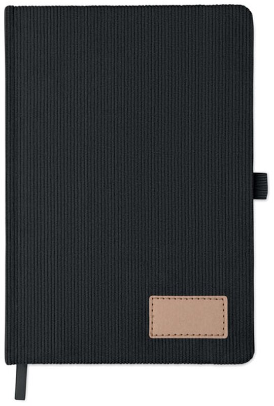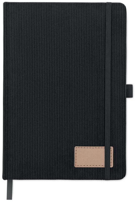 Zápisník A5 s tvrdými deskami potaženými polyesterovým RPET manšestrem. 192 linkovaných stránek z recyklovaného 70g papíru. Zavírání na gumičku, poutko na pero, záložka a etiketa z kraftového papíru.