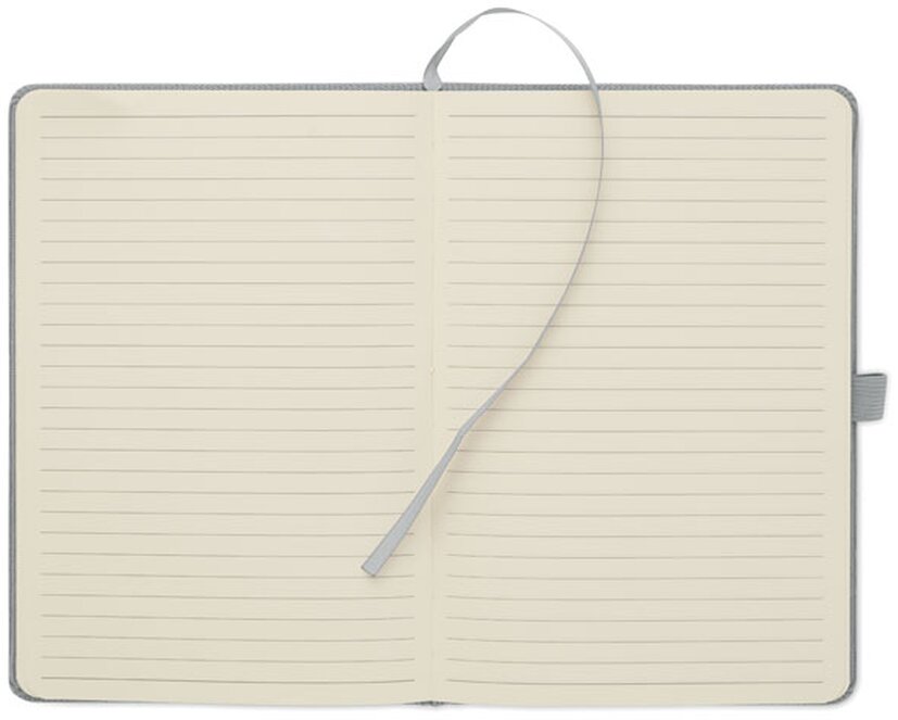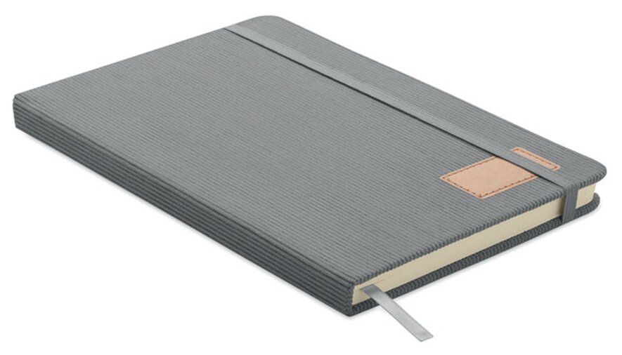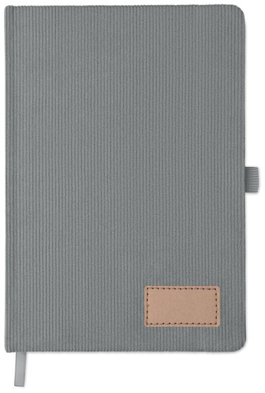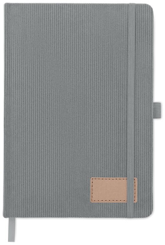 Zápisník A5 s tvrdými deskami potaženými polyesterovým RPET manšestrem. 192 linkovaných stránek z recyklovaného 70g papíru. Zavírání na gumičku, poutko na pero, záložka a etiketa z kraftového papíru.