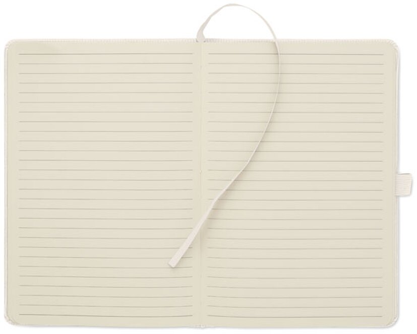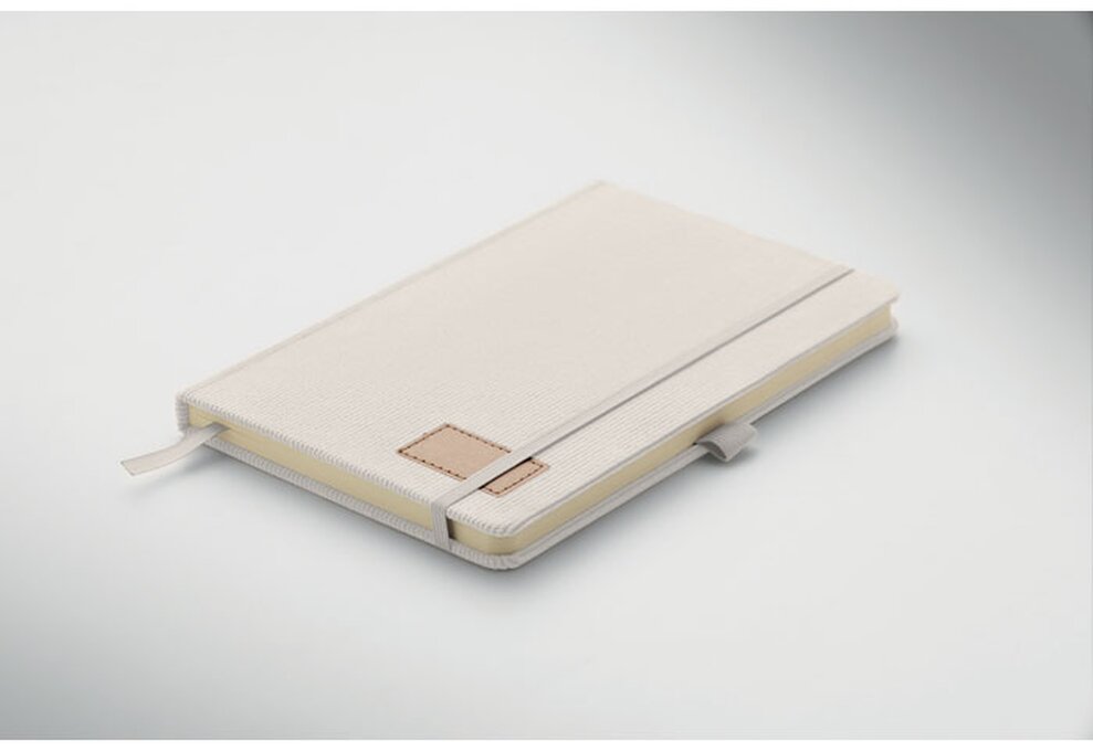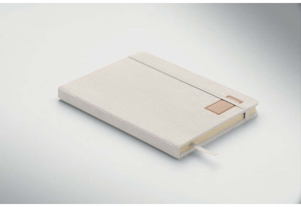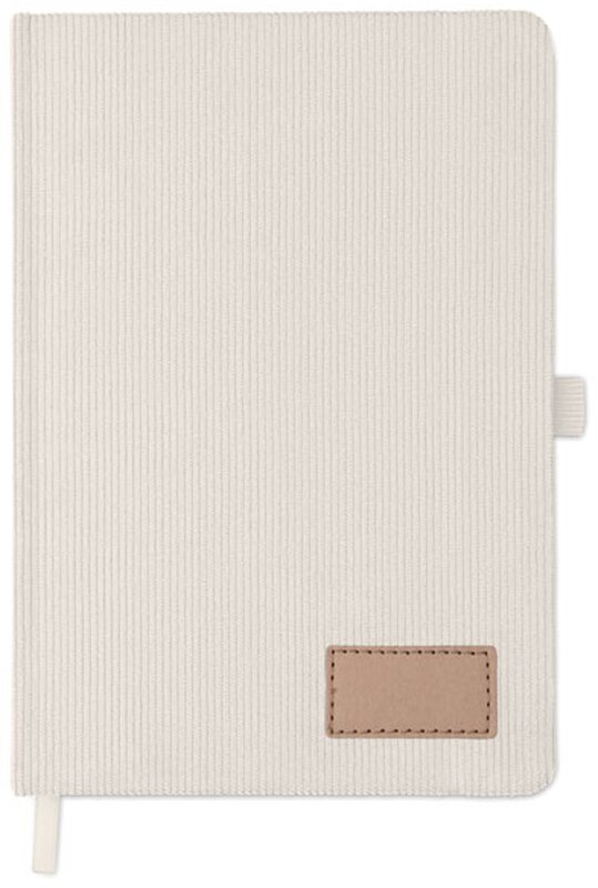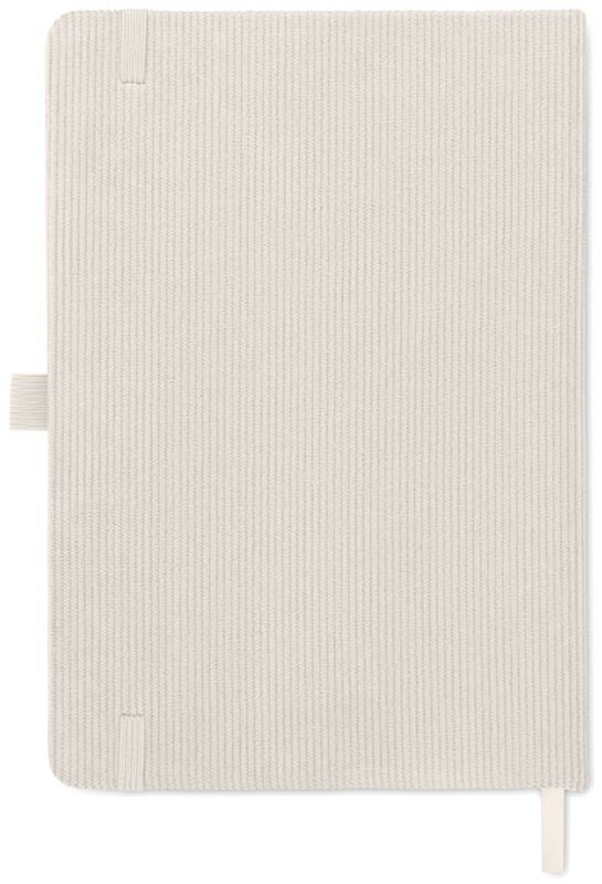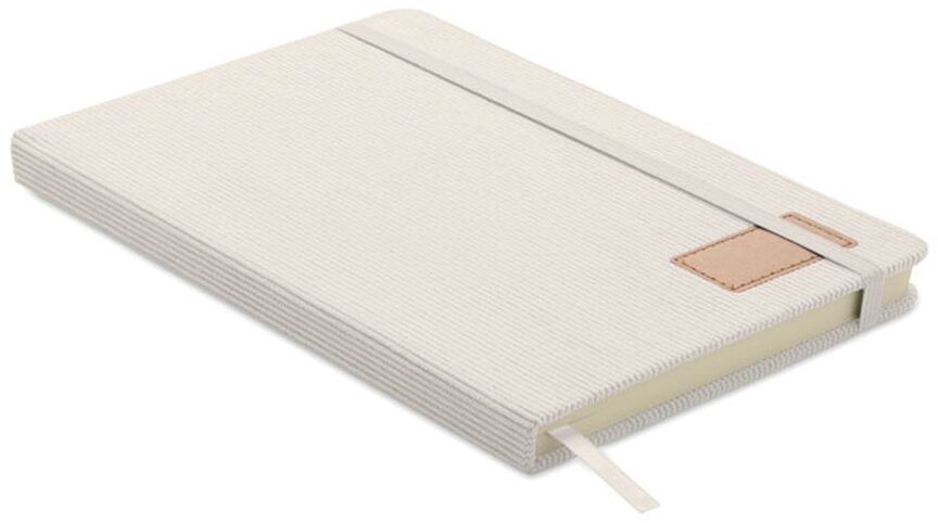 Zápisník A5 s tvrdými deskami potaženými polyesterovým RPET manšestrem. 192 linkovaných stránek z recyklovaného 70g papíru. Zavírání na gumičku, poutko na pero, záložka a etiketa z kraftového papíru.