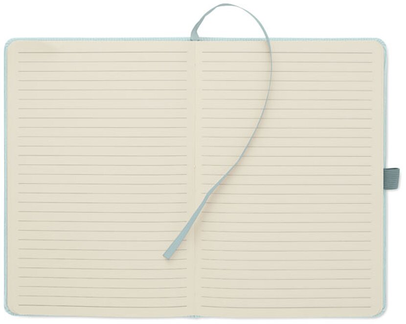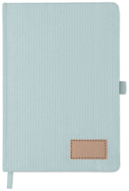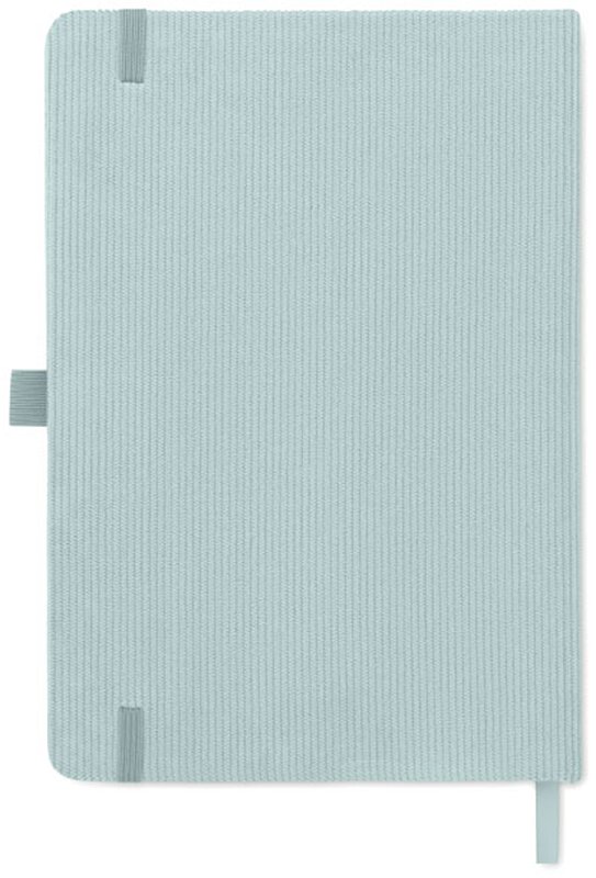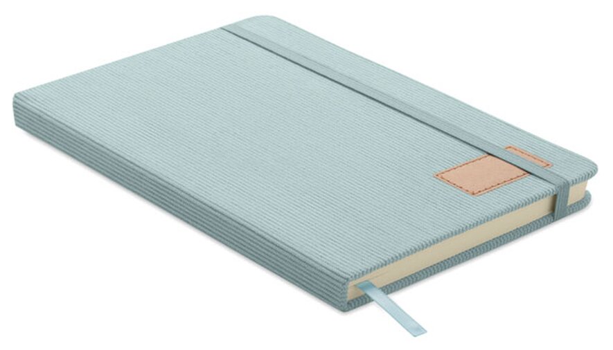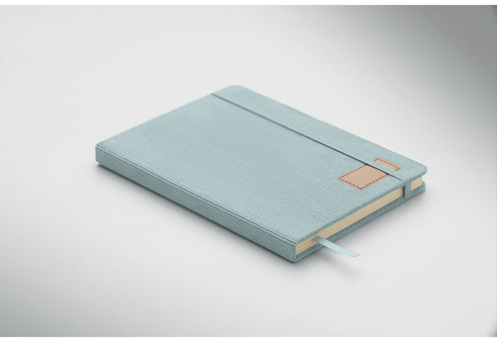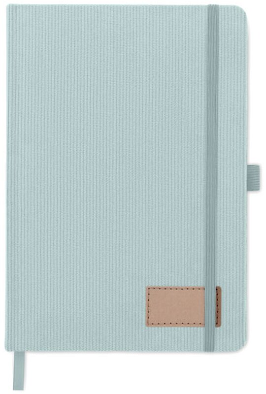 Zápisník A5 s tvrdými deskami potaženými polyesterovým RPET manšestrem. 192 linkovaných stránek z recyklovaného 70g papíru. Zavírání na gumičku, poutko na pero, záložka a etiketa z kraftového papíru.