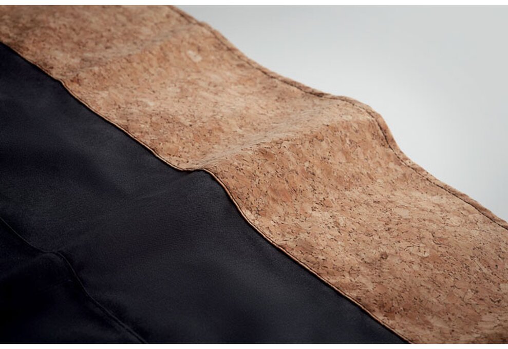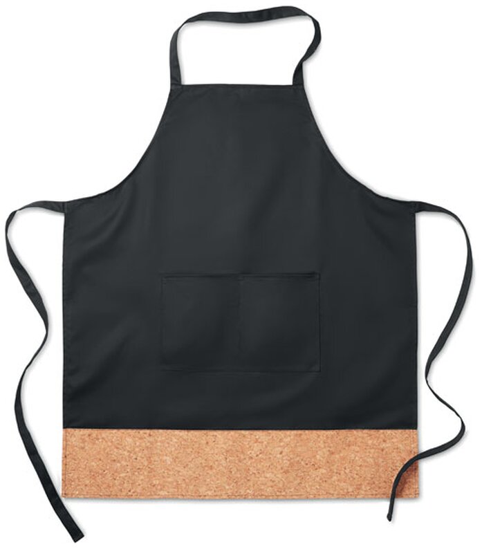 Elegantní stahovací kuchyňská zástěra s korkovým lemem a 2 předními kapsami.