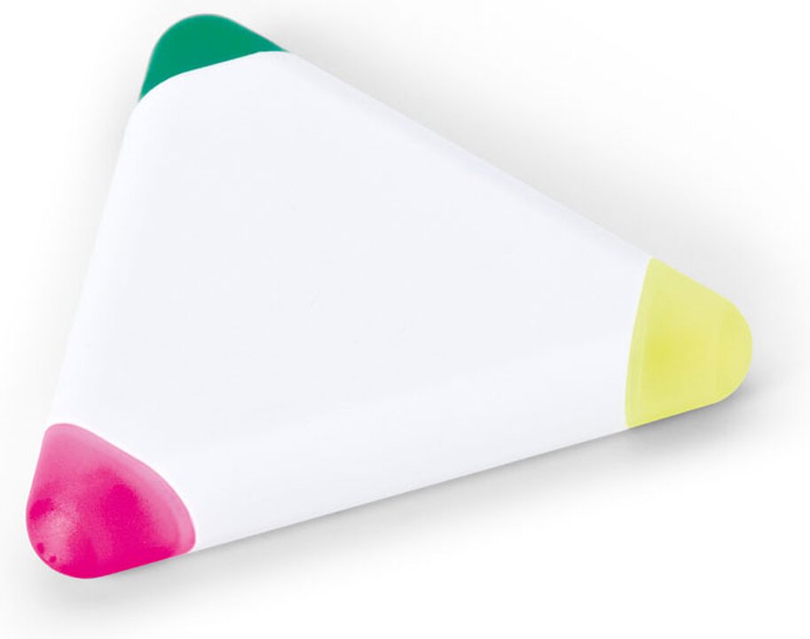 Zvýrazňovač ve tvaru trojúhelníku se třemi barvami - žlutá, růžová a zelená.